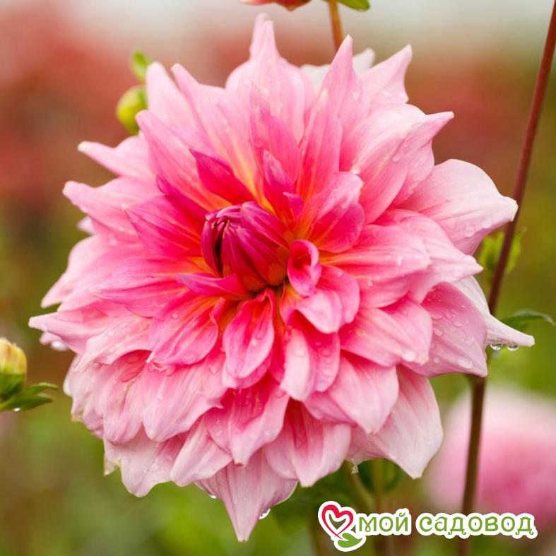 Это кустовое многолетнее растение, принадлежащее семейству астровых. Оно характеризуется прямостоячими и прочными стеблями, высотой от 60 – 100 см. Листья темно-зеленые, глянцевые, с красивой текстурой. Цветки крупные и яркие, с махровыми или полумахровыми лепестками. Они могут быть одиночными или собранными в крупные соцветия. В полном роспуске диаметр равен 10 – 12 см. Лепестки окрашены в светло-розовый цвет. Края острые, слегка согнутые вдоль жилки.